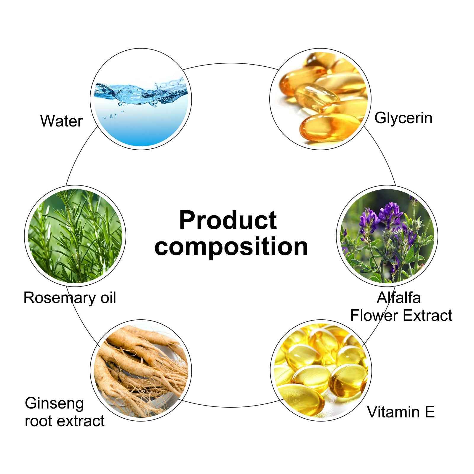 Ingredients: Water, glycerin, rosemary oil, alfalfa flower extract, ginseng root extract, Vitamin E