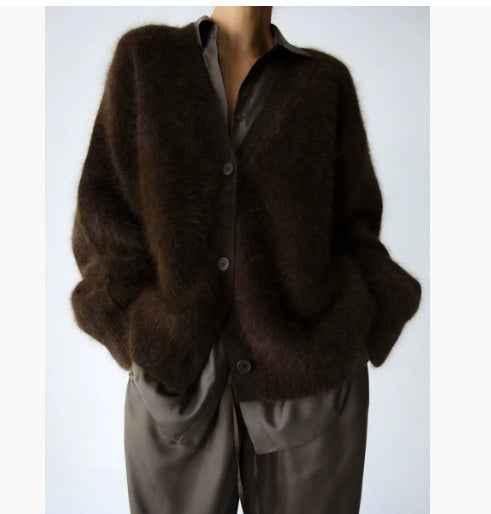 Shopping for clothing should not only be about finding the right fit but also about investing in pieces that elevate your wardrobe. Our loose v-neck cardigan is designed with your lifestyle in mind. With its quality craftsmanship and attention to detail, it's a reliable option that will serve you well season after season. Take a step towards a more stylish wardrobe that combines functionality and trendy aesthetics.